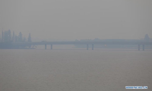 Photo taken on Dec. 17, 2019 shows the smoke-shrouded Lake Burley Griffin in Canberra, Australia. Air pollution caused by bushfires continues in Canberra. (Photo by Chu Chen/Xinhua)