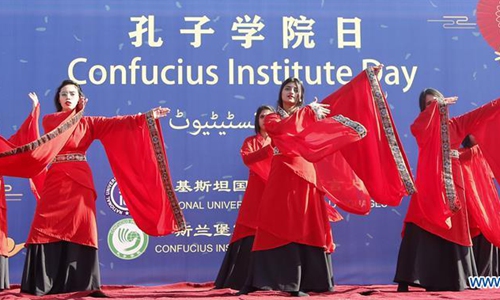 Pakistani students perform during Confucius Institute Day event at the National University of Modern Languages in Islamabad, capital of Pakistan on Dec. 17, 2019. The Confucius Institute at the National University of Modern Languages in Islamabad celebrated the Confucius Institute Day on Tuesday. During the celebration, visitors enjoyed Chinese culture including traditional clothing, Chinese tea, martial arts and paper-cutting. (Xinhua/Ahmad Kamal)