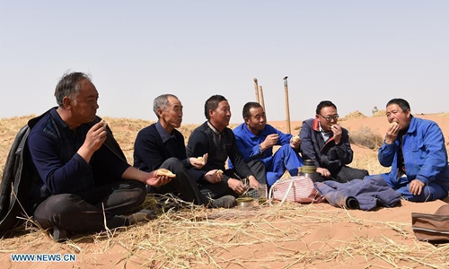 Staff members of Babusha forest farm have lunch during a break after work to prevent and control desertification in a desert in Gulang County, northwest China's Gansu Province, March 26, 2019. (Xinhua/Fan Peishen)