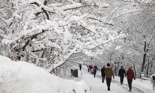 Hearty residents enjoy a wintery walk through Beishan Park in Jilin, Northeast China's Jilin Province on Tuesday. Photo: CNSphoto