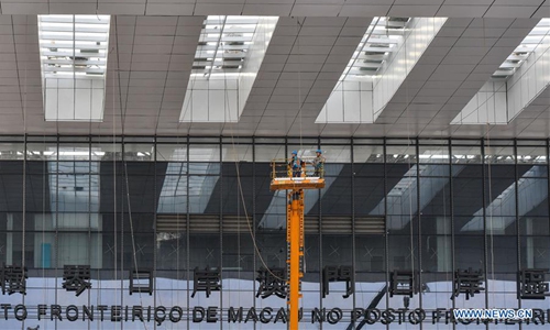 A worker builds the new Hengqin port in Zhuhai, south China's Guangdong Province, Dec. 10, 2019. After three years of construction, the new Hengqin port is ready for visitors to travel between Zhuhai and the Lotus port in Macao. (Photo: Xinhua)