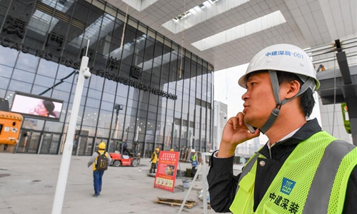 Fang Wenbiao, a decoration project manager, inspects the construction site of the east square of the new Hengqin port in Zhuhai, south China's Guangdong Province, Dec. 10, 2019. After three years of construction, the new Hengqin port is ready for visitors to travel between Zhuhai and the Lotus port in Macao.(Photo: Xinhua)