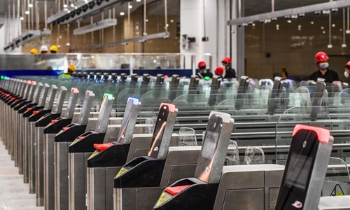 Technical workers test turnstiles at the new Hengqin port in Zhuhai, south China's Guangdong Province, Dec. 10, 2019. After three years of construction, the new Hengqin port is ready for visitors to travel between Zhuhai and the Lotus port in Macao. (Photo: Xinhua)