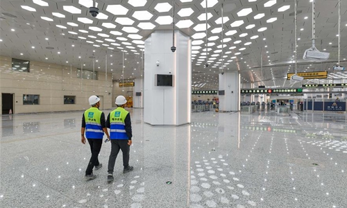 Construction workers examine the ceiling decorations at the new Hengqin port in Zhuhai, south China's Guangdong Province, Dec. 10, 2019. After three years of construction, the new Hengqin port is ready for visitors to travel between Zhuhai and the Lotus port in Macao. (Photo: Xinhua)