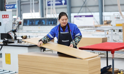 A wood processing worker performs tasks at a smart factory in Liangping, Southwest China's Chongqing Municipality. With smart manufacturing being used in processes like edge banding and drilling, production efficiency has been largely improved. Photo: IC