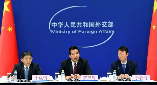 (From left) Li Chenggang, Assistant Minister of Commerce, Luo Zhaohui, Vice Foreign Minister and Yu Dunhai, Deputy Director-General from Ministry of Foreign Affairs at the press briefing on Thursday. Photo: Courtesy of Ministry of Foreign Affairs.