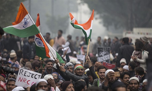 People participate in a protest against the new citizenship law in New Delhi, India, Dec. 19, 2019. Countrywide massive protests against the controversial new citizenship law on Thursday rocked various Indian states, officials said. (Photo by Javed Dar/Xinhua)