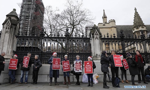 Demonstrators hold placards outside the Houses of Parliament following the State Opening of Parliament in London, Britain, on Dec. 19, 2019. British Queen Elizabeth II announced Thursday that Britain's departure from the European Union (EU) will be a priority for Prime Minister Boris Johnson's government. (Photo by Tim Ireland/Xinhua)