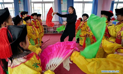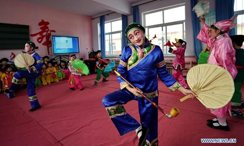 A teacher (C) demonstrates a movement in yangge dance, an officially recognized national intangible cultural heritage, for her pupils at the Xiaoyanying Primary School in Luanzhou City of north China's Hebei Province, Dec. 19, 2019. The Xiaoyanying Primary School introduced yangge dance to its campus several years ago and has invited local performers to teach regular classes on this art widely popular in eastern parts of Hebei Province. (Xinhua/Mu Yu)