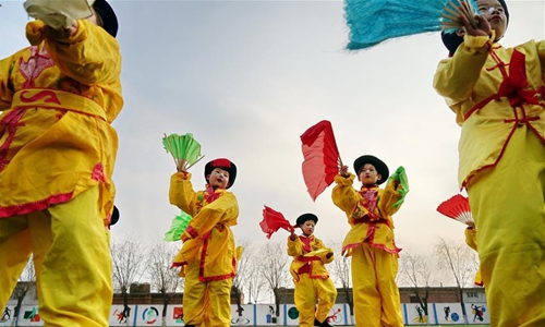 Pupils of the Xiaoyanying Primary School rehearse yangge dance, an officially recognized national intangible cultural heritage, in Luanzhou City of north China's Hebei Province, Dec. 19, 2019. The Xiaoyanying Primary School introduced yangge dance to its campus several years ago and has invited local performers to teach regular classes on this art widely popular in eastern parts of Hebei Province. (Xinhua/Mu Yu)