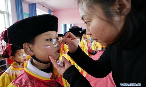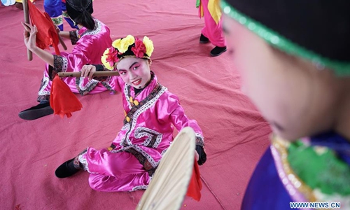 A teacher (R) prepares stage make-up for a pupil attending dressed rehearsal of yangge dance, an officially recognized national intangible cultural heritage, at the Xiaoyanying Primary School in Luanzhou City of north China's Hebei Province, Dec. 19, 2019. The Xiaoyanying Primary School introduced yangge dance to its campus several years ago and has invited local performers to teach regular classes on this art widely popular in eastern parts of Hebei Province. (Xinhua/Mu Yu)