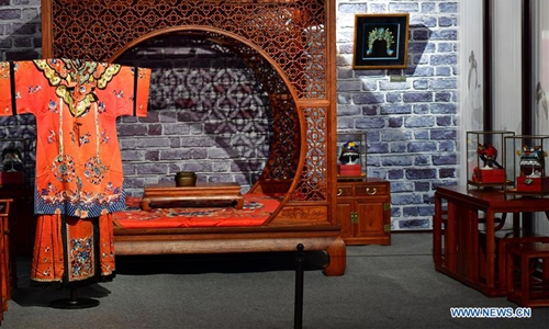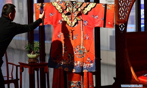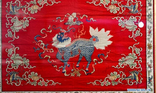 A visitor takes a photo in an exhibition about Jin embroidery, a traditional craft in Shanxi Province, at the Taiyuan Art Museum in Taiyuan, north China's Shanxi Province, Dec. 19, 2019. Photo:Xinhua