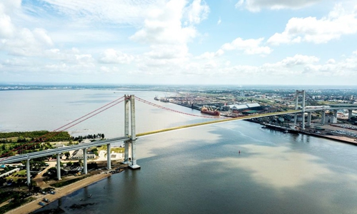 Aerial photo taken on April 8, 2019 shows the Maputo Bay Bridge in Maputo, Mozambique. The bridge is part of the Maputo Bridge and Link Roads project built by the China Road and Bridge Corporation, with Chinese standards and financing support. (Xinhua/Zhang Yu)