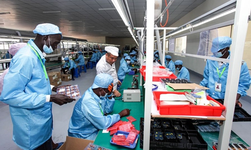 Employees of ENGO Holdings Limited assemble phones after the commissioning in Mukono, Uganda, Nov. 22, 2019. Chinese electronics company, Engo Holdings Group Limited, opened on Nov. 22, 2019 a 5 million U.S. dollar factory in Uganda that manufactured phones and laptop computers. (Xinhua/Hajarah Nalwadda)