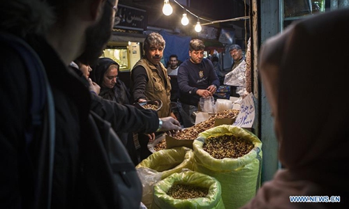 People buy nuts for Yalda Night at an old bazaar in Tonekabon, Iran, Dec. 21, 2019. Yalda Night is celebrated on the longest night of a year, which is locally believed to be on Dec. 21, the eve of winter solstice. (Photo by Ahmad Halabisaz/Xinhua)