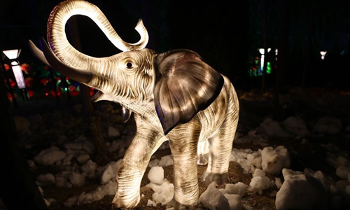 Photo taken on Dec. 21, 2019 shows an elephant illumination exhibited at a lighted ice and snow festival in Chengguan District of Lanzhou City, northwest China's Gansu Province. The winter festival opened here Saturday, featuring ice-snow sculpture, light show, snow homestay, among others. (Xinhua/Geng Xinning)