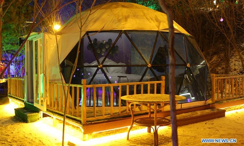 Photo taken on Dec. 21, 2019 shows a homestay at a lighted ice and snow festival in Chengguan District of Lanzhou City, northwest China's Gansu Province. The winter festival opened here Saturday, featuring ice-snow sculpture, light show, snow homestay, among others. (Xinhua/Geng Xinning)