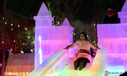 A tourist plays on ice slide at a lighted ice and snow festival in Chengguan District of Lanzhou City, northwest China's Gansu Province, Dec. 21, 2019. The winter festival opened here Saturday, featuring ice-snow sculpture, light show, snow homestay, among others. (Xinhua/Geng Xinning)