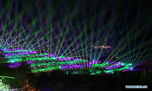Photo taken on Dec. 21, 2019 shows a light show at a lighted ice and snow festival in Chengguan District of Lanzhou City, northwest China's Gansu Province. The winter festival opened here Saturday, featuring ice-snow sculpture, light show, snow homestay, among others. (Xinhua/Geng Xinning)