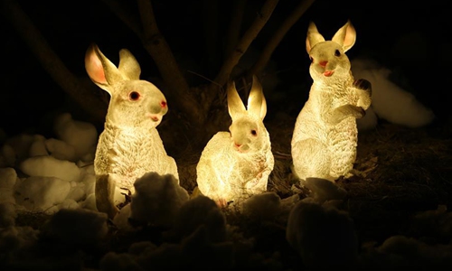 Photo taken on Dec. 21, 2019 shows animal illuminations exhibited at a lighted ice and snow festival in Chengguan District of Lanzhou City, northwest China's Gansu Province. The winter festival opened here Saturday, featuring ice-snow sculpture, light show, snow homestay, among others. (Xinhua/Geng Xinning)