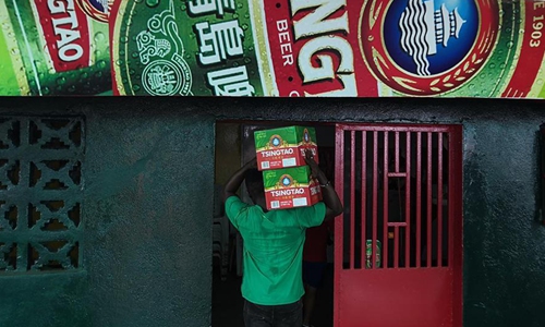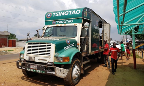 Photo taken on Dec. 19, 2019 shows packs of Tsingtao beer delivered to local shop ahead of Tsingtao Beer Festival in Monrovia, Liberia. The Tsingtao Beer Festival in Liberia kicked off on Saturday with activities of a 5-km mini-marathon and a friendly football match held in the capital city Monrovia. The festival will be held in 15 countries between December 2019 and October 2020. (Photo by Ma Xing/Xinhua)
