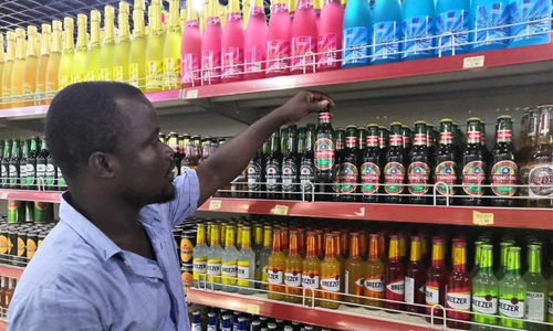 Local people selects Tsingtao beer ahead of Tsingtao Beer Festival in Monrovia, Liberia, Dec. 19, 2019. The Tsingtao Beer Festival in Liberia kicked off on Saturday with activities of a 5-km mini-marathon and a friendly football match held in the capital city Monrovia. The festival will be held in 15 countries between December 2019 and October 2020. (Photo by Ma Xing/Xinhua)