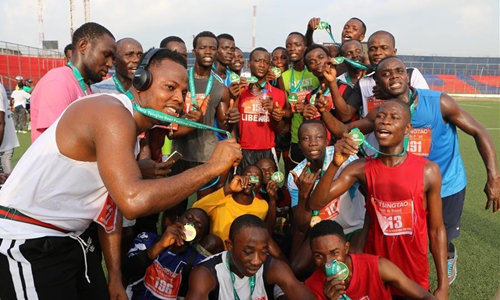 Local people show medals after attending a marathon at the opening of Tsingtao Beer Festival in Monrovia, Liberia, Dec. 21, 2019. The Tsingtao Beer Festival in Liberia kicked off on Saturday with activities of a 5-km mini-marathon and a friendly football match held in the capital city Monrovia. The festival will be held in 15 countries between December 2019 and October 2020. (Photo by Ma Xing/Xinhua)