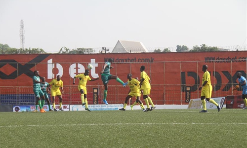 A friendly football match is held at the opening of Tsingtao Beer Festival in Monrovia, Liberia, on Dec. 21, 2019. The Tsingtao Beer Festival in Liberia kicked off on Saturday with activities of a 5-km mini-marathon and a friendly football match held in the capital city Monrovia. The festival will be held in 15 countries between December 2019 and October 2020. (Xinhua/Guo Jun)