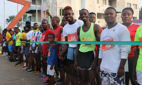 Local people attend a marathon at the opening of Tsingtao Beer Festival in Monrovia, Liberia, Dec. 21, 2019. The Tsingtao Beer Festival in Liberia kicked off on Saturday with activities of a 5-km mini-marathon and a friendly football match held in the capital city Monrovia. The festival will be held in 15 countries between December 2019 and October 2020. (Photo by Ma Xing/Xinhua)