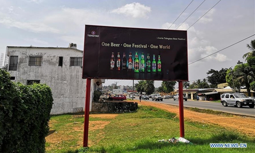 Photo taken on Dec. 19, 2019 shows a billboard advertising Tsingtao Beer Festival in Monrovia, Liberia. The Tsingtao Beer Festival in Liberia kicked off on Saturday with activities of a 5-km mini-marathon and a friendly football match held in the capital city Monrovia. The festival will be held in 15 countries between December 2019 and October 2020. (Photo by Ma Xing/Xinhua)