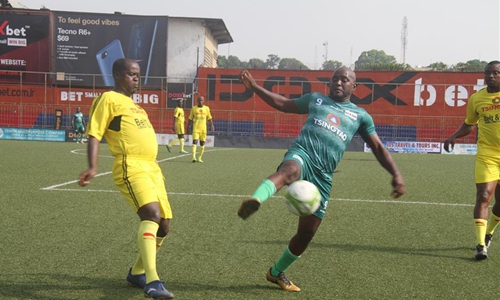 A friendly football match is held at the opening of Tsingtao Beer Festival in Monrovia, Liberia, Dec. 21, 2019. The Tsingtao Beer Festival in Liberia kicked off on Saturday with activities of a 5-km mini-marathon and a friendly football match held in the capital city Monrovia. The festival will be held in 15 countries between December 2019 and October 2020. (Xinhua/Guo Jun)