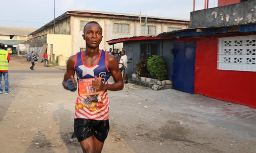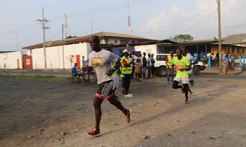 A runner takes part in a marathon at the opening of Tsingtao Beer Festival in Monrovia, Liberia, Dec. 21, 2019. The Tsingtao Beer Festival in Liberia kicked off on Saturday with activities of a 5-km mini-marathon and a friendly football match held in the capital city Monrovia. The festival will be held in 15 countries between December 2019 and October 2020. (Photo by Ma Xing/Xinhua)