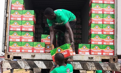 Local people unload packs of Tsingtao beer ahead of Tsingtao Beer Festival in Monrovia, Liberia, Dec. 19, 2019. The Tsingtao Beer Festival in Liberia kicked off on Saturday with activities of a 5-km mini-marathon and a friendly football match held in the capital city Monrovia. The festival will be held in 15 countries between December 2019 and October 2020. (Photo by Ma Xing/Xinhua)