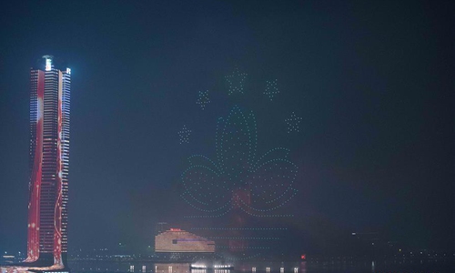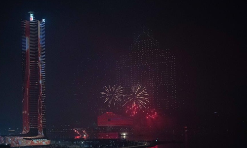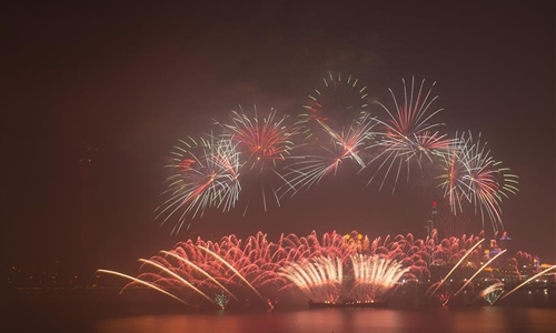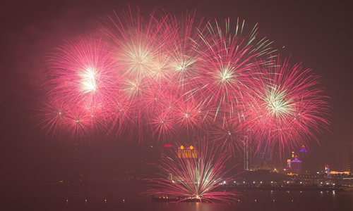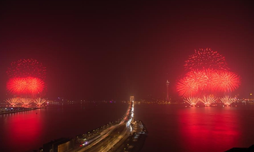 Fireworks explode over the sky in south China's Macao, Dec. 22, 2019. Macao and its neighboring city Zhuhai jointly held a firework show to celebrate the 20th anniversary of Macao's return to the motherland on Sunday. Photo:Xinhua