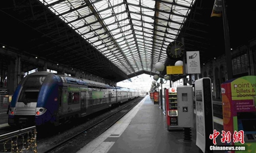 A high speed train stops at a station in Paris, Dec. 22, 2019. 90% of high-speed trains and 70% of regional trains were cancelled on Friday, the French railway announced. The French civil aviation authority instructed airlines to reduce their Friday flight traffic from central airports to 20%. (Photo/China News Service)
