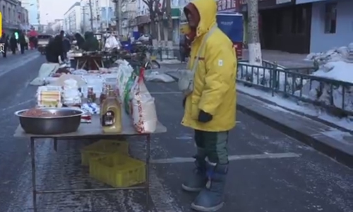 A street seller stays warm in homemade carpet boots in Heihe, Northeast China's Heilongjiang Province. Screenshot from Pear Video