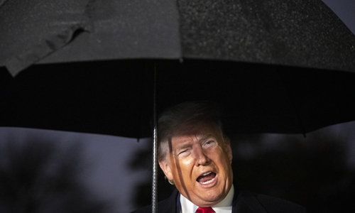 US President Donald Trump holds an umbrella as he speaks to journalists before boarding Marine One on the South Lawn of the White House on Tuesday in Washington, DC. Earlier in the day, House Democrats announced they will seek two articles of impeachment against him. Photo: AFP