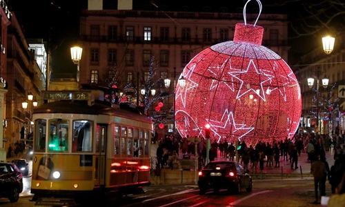People gather around a giant Christmas decoration in Lisbon, Portugal, Dec. 22, 2019. Photo:Xinhua