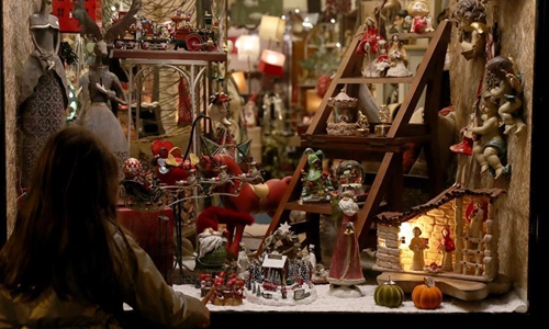 A child looks at Christmas figures in a shop window in Lisbon, Portugal, Dec. 22, 2019. Photo:Xinhua