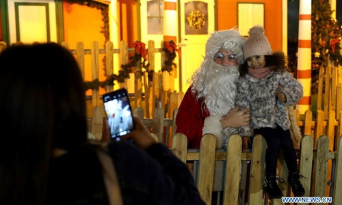 A child takes a picture with a Santa Claus at a Christmas market in Lisbon, Portugal, Dec. 22, 2019. Photo:Xinhua