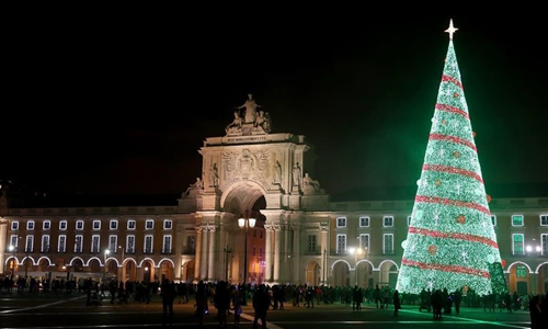 A large Christmas tree is lit up for the upcoming Christmas in Lisbon, Portugal, Dec. 22, 2019. Photo:Xinhua