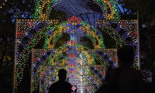 People are seen near the Christmas light installations at the "Christmas Wonderland" held in Singapore's Gardens by the Bay on Dec. 23, 2019. Photo:Xinhua