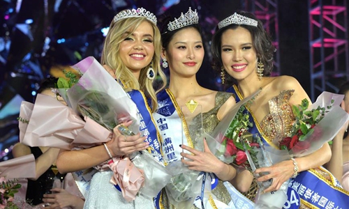 A contestant from Russia presents the costumes during an international beauty contest in Manzhouli, north China's Inner Mongolia Autonomous Region, Dec. 23, 2019. The final of the 16th China-Russia-Mongolia International Beauty Pageant was held here on Monday. Photo:Xinhua