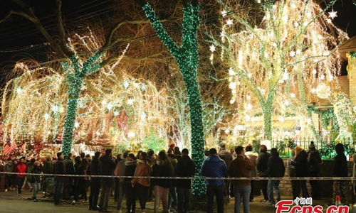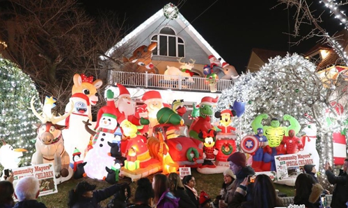 Photo taken on Dec. 23, 2019 shows the Christmas decorations in Dyker heights of Brooklyn, New York, the United States. Every year, homeowners hang Christmas lights and decorations at Dyker heights, which turn the blocks into a dreamy "Christmas Village". (Photo/China News Service)
