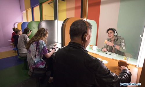 People gather at the Color Factory lobby and wait for their self-guided tour in Houston, Texas, the United States, on Dec. 23, 2019. Color Factory is an interactive art exhibition started in San Francisco in 2017, then expanded to New York in 2018. The more than 1,800 square-meter Houston location opened in late October. (Photo by Li Yijin/Xinhua)
