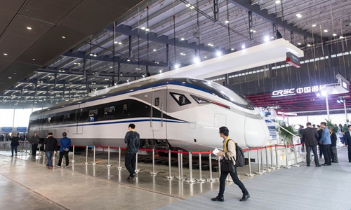 Visitors look at the CJ6 intercity EMU train manufactured by CRRC Zhuzhou Locomotive Co., Ltd. at the 2019 China International Rail Transit and Equipment Manufacturing Industry Expo in Changsha, central China's Hunan Province, Oct. 18, 2019. (Xinhua/Chen Sihan)