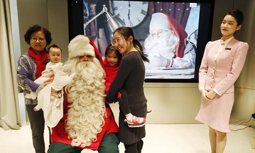 People pose for photo with Santa Claus at a Finnish tourism event held on Monday in Shanghai. Photo: CNSphoto
