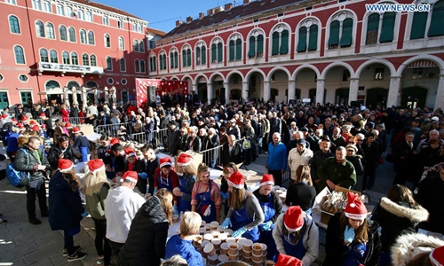 People wait to enjoy free serving of cod fish stew, a traditional Christmas Eve specialty made of dried cod fish and potatoes, at Ban Josip Jelacic Square in the city center of Zagreb, Croatia, Dec. 24, 2019. Photo:Xinhua