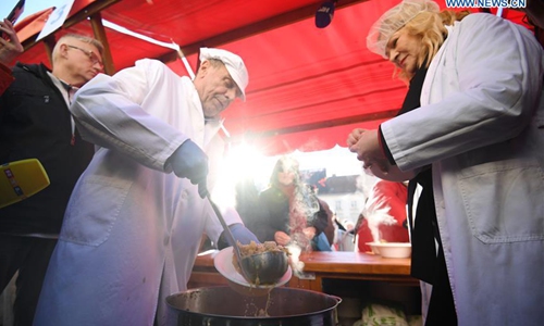 Mayor of Zagreb Milan Bandic (2nd L) serves free cod fish stew, a traditional Christmas Eve specialty made of dried cod fish and potatoes, at Ban Josip Jelacic Square in the city center of Zagreb, Croatia, Dec. 24, 2019. Photo:Xinhua
