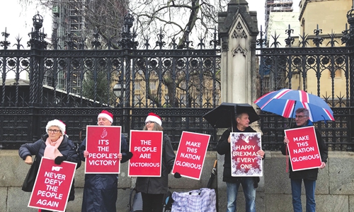 Pro-Brexit campaigners hold placards near the Houses of Parliament on Friday in London, the UK. Photo: Sun Wei/GT